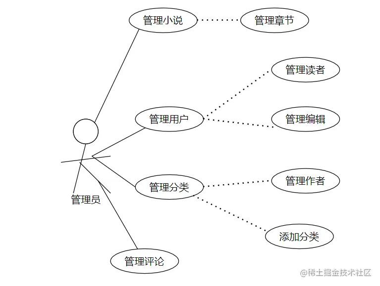 管理员有着管理小说、管理用户、管理分类、管理评论、管理章节、管理读者、管理编辑、管理作者、添加分类等功能。