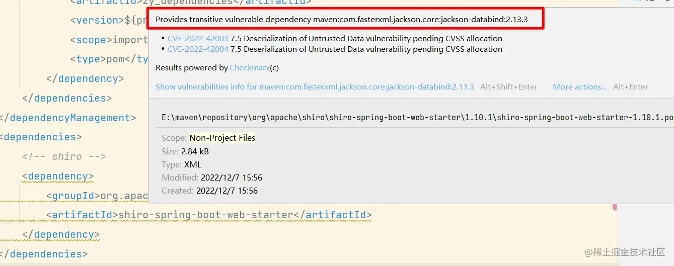 百度了一把,大意是jackson-databind:2.13.3有漏洞,有风险,警告使用,下面是具体的CVE漏洞,我点进去看了下,是两个中危漏洞.