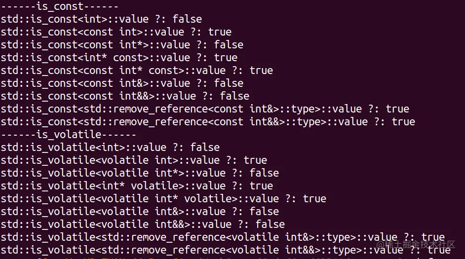 - 对于引用类型(左值引用或右值引用),都是false,原因与xxx int*类似,从右往左解释,这是一个左值/右值引用,引用类型为int,该类型的属性为const或volatile,所以该引用类型不被const或volatile修饰,如果需要判断其类型,则需要使用remove_reference去除引用之后进行判断。