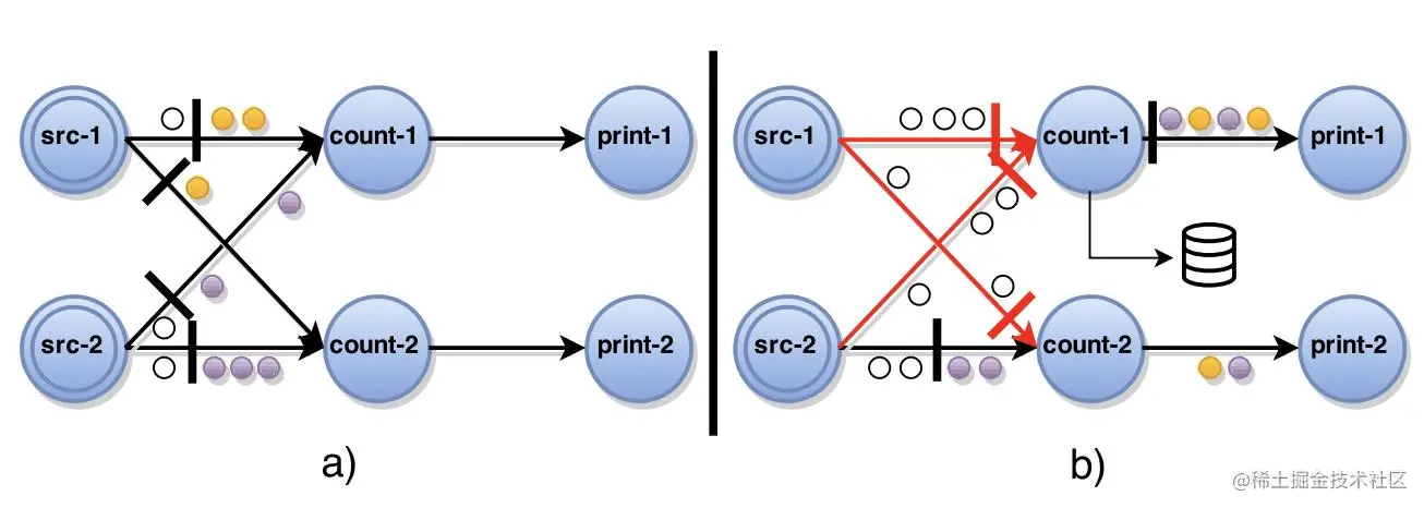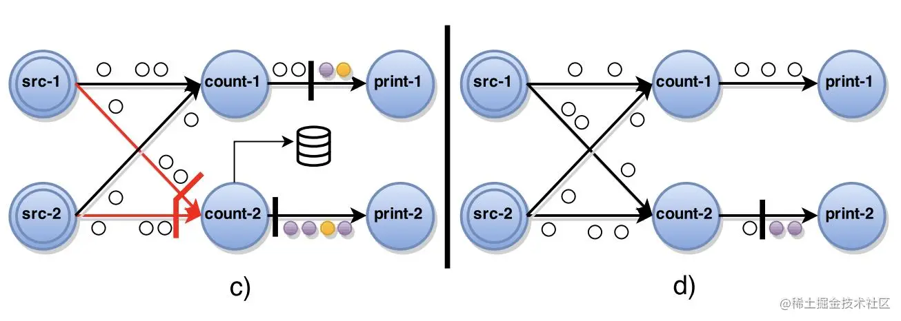 我们看到 Asynchronous Barrier Snapshotting 算法的流程和 Chandy-Lamport 算法很相似,但也有很大的不同之处: