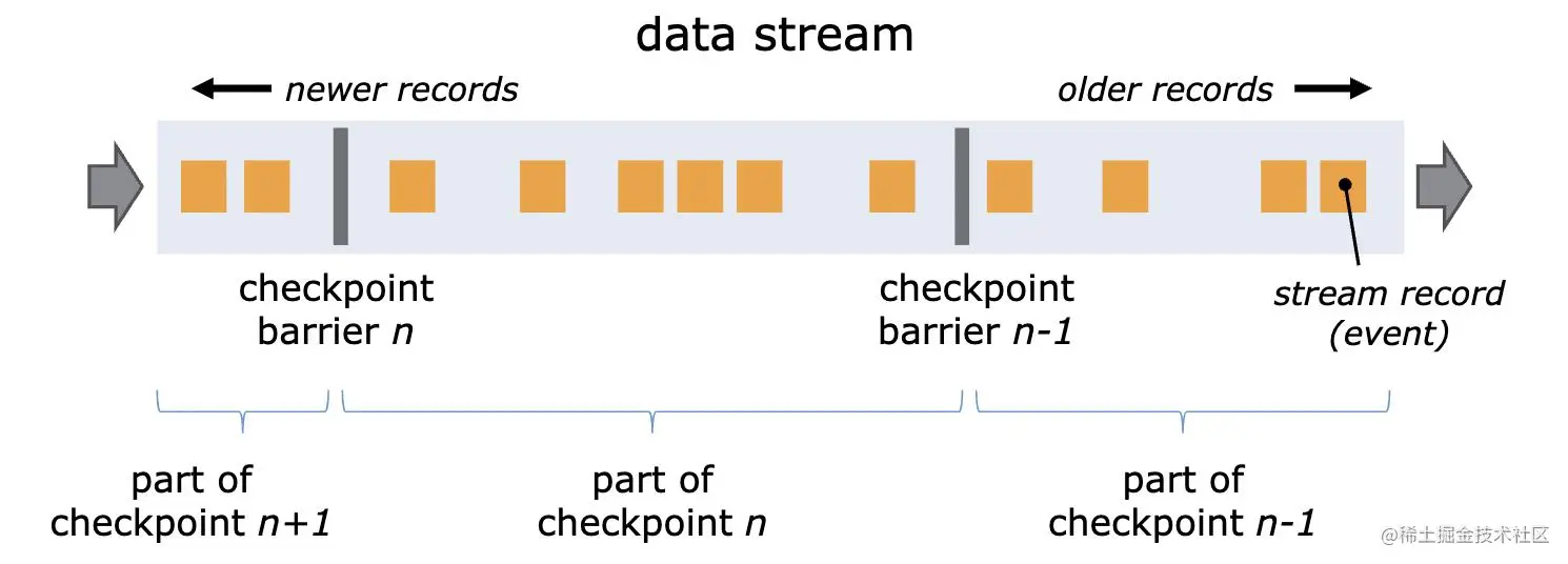 Chandy-Lamport 算法提供了一个最终一致的系统状态快照算法,使用 Marker 消息分隔了当前快照和下一个快照的消息。而在 Asynchronous Barrier Snapshotting 算法中,也使用了一个 Marker 消息,只是它的名称叫做 Barrier 屏障,Barrier 的作用和 Marker 消息一样,用来分隔不同快照的消息,Barrier 由快照中央协调器周期性产生,以触发系统周期性的执行快照。如下图,第 n - 1个 Barrier 屏障之后、第 n 个 Barrier 屏障之前的所有数据都属于第 n 个快照: