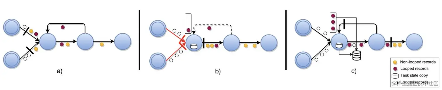 如上图,我们把从下游回流到上游的数据流称为 back-edge,当一个有 back-edge 的节点做快照时,执行过程如下: