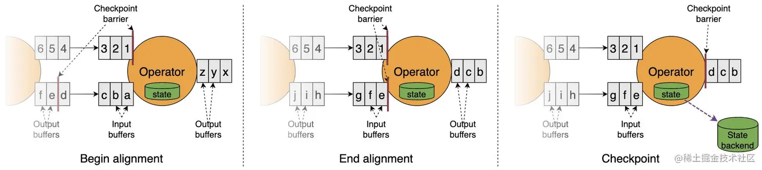 - 在 C-L 算法中,节点收到第一个 Marker 消息后即开始对节点状态进行快照,之后记录其他输入通道的状态。而在 ABS 算法中,节点收到第一个 Barrier 后(如果节点有多个输入数据流),并不会立刻进行快照,而是等带所有的输入通道都收到 Barrier 后,才进行快照。这个过程称之为 Barrier 对齐。Barrier 对齐过程如下图: