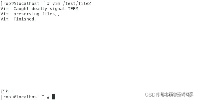 [root@localhost ~]# kill -9 6784 //vim对file1的编辑进程号为6484,使用9号信号进行操作