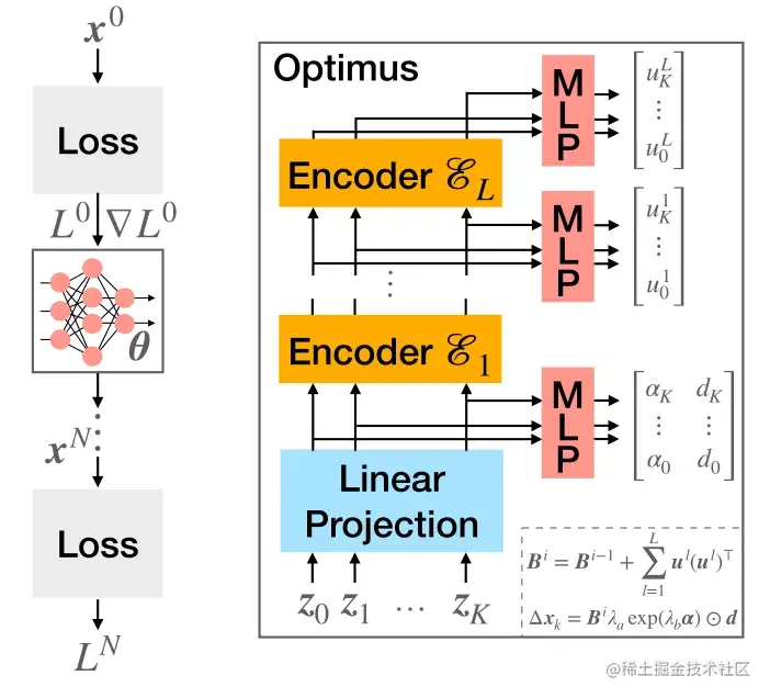 图2。左:基于transformer的学习型优化器Optimus迭代最小化损失L的概述示意图。右:Optimus的架构由L个堆叠的Transformer编码器组成,在给定的特征向量zk下预测参数更新∆xk。