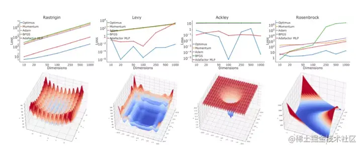 图1。第一行:评估结果,显示优化器为第一行对应的目标函数所达到的平均目标值(y轴)与目标函数的维度(x轴)的对比。最下面一行:用于评估本文方法的目标函数的例子。