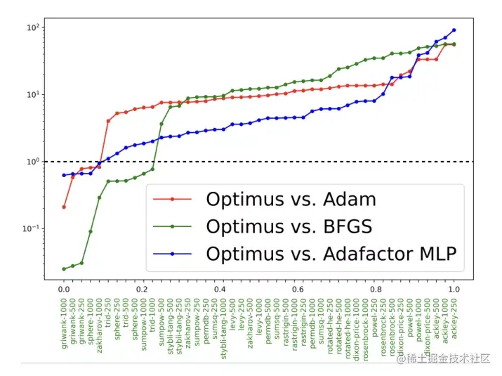 图4。Optimus与Adam、BFGS和Adafactor MLP在达到目标函数预定义最小值所需的相对迭代次数的比较。