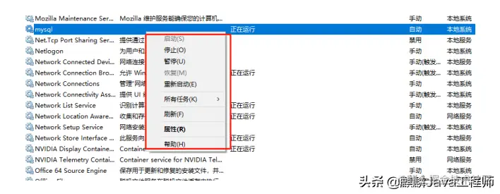 会打开服务窗⼜,在服务窗⼜中找到mysql服务,点击右键可以启动或者停⽌