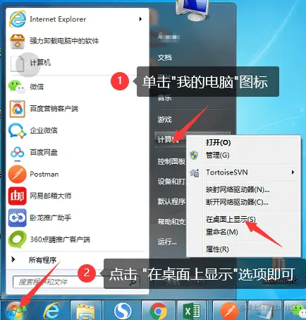 操作步骤: 同样是打开【开始菜单】,找到【我的电脑】图标。不同的是,鼠标右键【我的电脑】图标,在弹出的窗口,点击【在桌面上显示】。点击成功,就可以在电脑桌面上看到消失的电脑图标了。如下图: