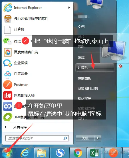 操作步骤: 打开电脑的【开始菜单】,在里面找到【我的电脑】图标,或者【计算机】图标。找到后,用鼠标把这个图标拖动到电脑桌面上。如下图:
