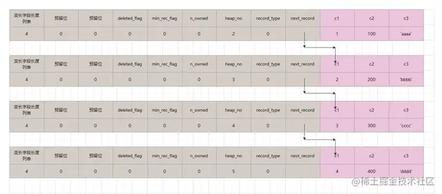 根据行记录结构中的next_recrod属性的含义,多条行记录是以单向链表的形式存储。mysql为了后续更好的查询,单向链表上的记录是按照主键顺序排列的。 上述这四条记录,可以显示的画成: