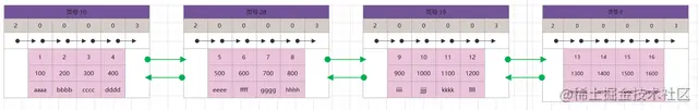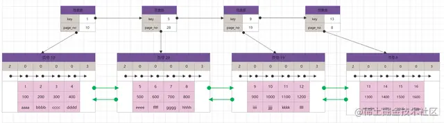上文使用的数据共有16条,为了演示这个双链表的效果,现在假设【仅仅是假设】每个页中存放不超过4条行记录。则上文的16条记录,形成的数据页双链表结构如下图【此处省略了许多非必要展示的字段】。