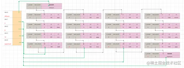 既然规定了页面中的最小记录 与 最大记录,理所应当,上文中串联各个行记录的单向链表,则应该有一个固定的头部 与 固定的尾部。 更新一下单链表的图。注意下infimum 与 supremum中的几个关键值。