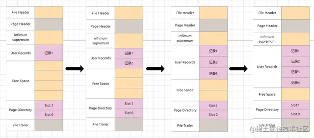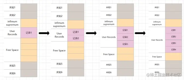 从上图中,我们可以猜到,数据页总共分成7个模块,目前咱们只关心 User Records 部分,它存储的就是用户真实的行记录。 但是一个数据页的空间总共是16K,不会自动增大空间,随着User Records 模块中的行记录越来越多,那么肯定有其他模块的空间就越来越小。 这个模块是 Free Space,是页中尚未使用的空间。更新一下上面这个图,补充 Free Space的内容。随着User Records中行记录的增加,Free Space空间则越来越小。