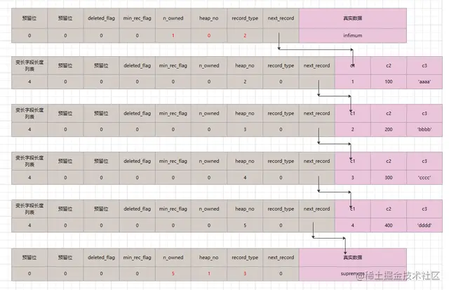 infimum: n_owned=1,表示是某一个分组的最后一条记录,当前分组共1条记录;record_type=2; next_record=第一条真实行记录的真实值的相对位置。 supremum: n_owned=5,表示是某个分组的最后一条记录,当前分组共5条记录;record_type=3; next_record=0,表示记录是本数据页中最后一条记录。