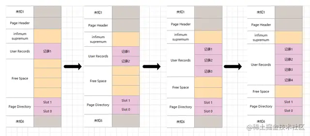 •之后每新增一条行记录,都会从Page Directory中找到对应的记录的主键值 比 待新增记录的主键值大 并且差值最小的slot【slot是一个组内最大的那条记录在页面中的地址偏移量,通过slot可以快速找到对应记录的主键值】, 然后把该slot对应的记录的 n_owned值加1,表示本组内新增了一条记录,直到该组中的记录数等于8个。