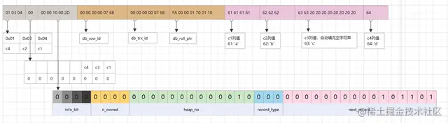 另外,mysql会默认为行记录添加一些列(隐藏列)。上图补充这些隐藏列之后,完整行记录的结构如: