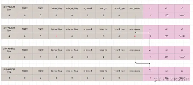 假如删除其中c1=2这条数据,则单向链表变更如下。 其中变化点为 c1=2 这条数据中,deleted_flag变更成0, next_record=0,但并没有从磁盘上直接清除掉,head_no也未清除。第一条记录的next_record 指向了第三条记录。