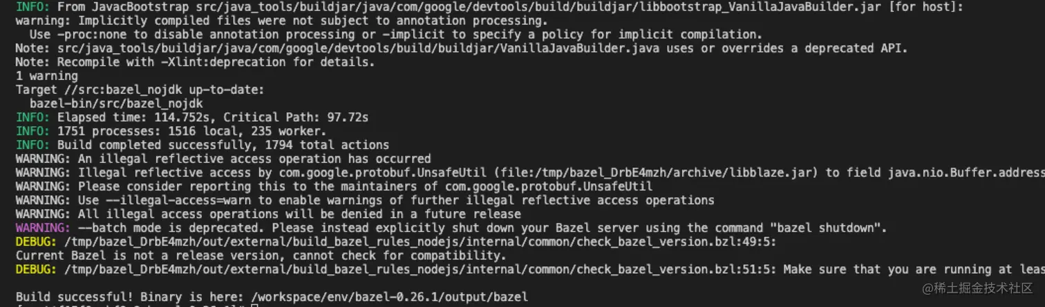 编译成功后的输出会在 output/bazel 中。这是一个独立的 bazel可执行二进制文件,可以直接建立软链 ln -s ~/bazel-src/output/bazel /usr/bin/bazel,这样就可以直接使用了。编译成功的输入如下,到此就大功告成了。