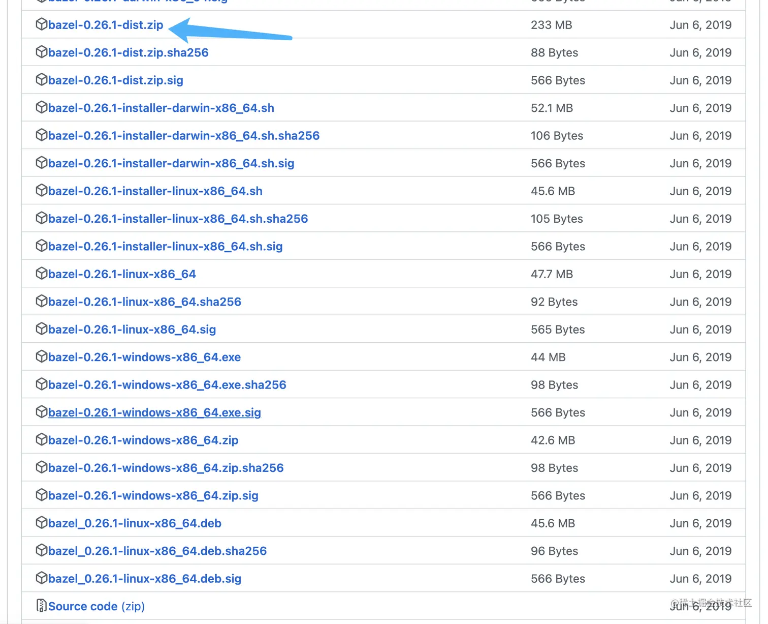 这里我选择了 0.26.1 版本的 bazel-0.26.1-dist.zip,如下。