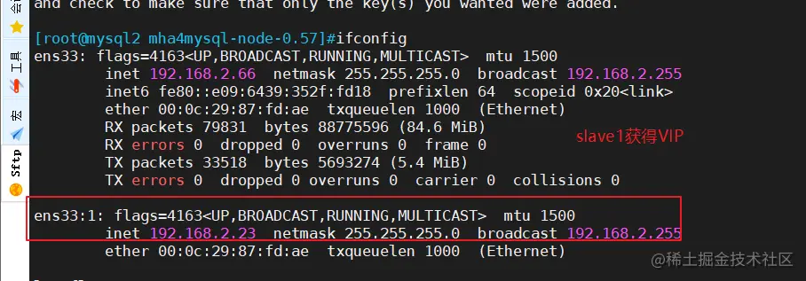 3.3 正常自动切换一次后,MHA 进程会退出。MHA 会自动修改 app1.cnf 文件内容,将宕机的 mysql1 节点删除。查看 mysql2 是否接管 VIP