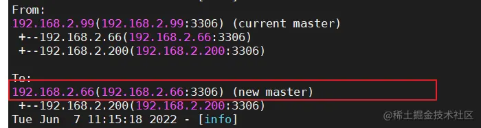 cat /var/log/masterha/app1/manager.log | grep "current master"