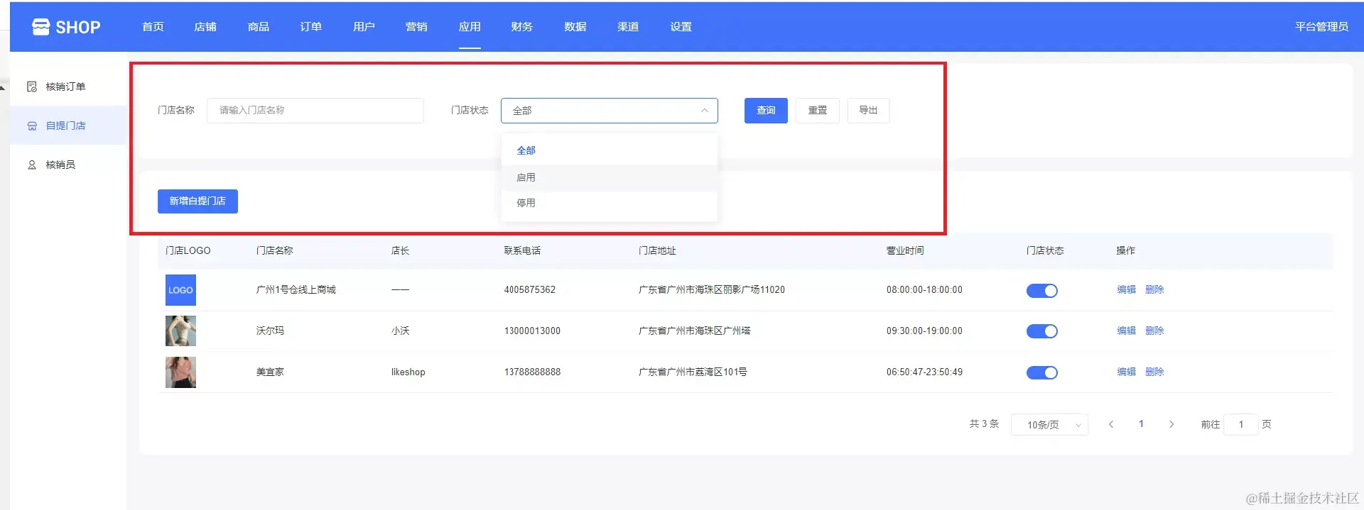 可以通过输入门店名称、选择门店状态查询自提门店。如下图所示: