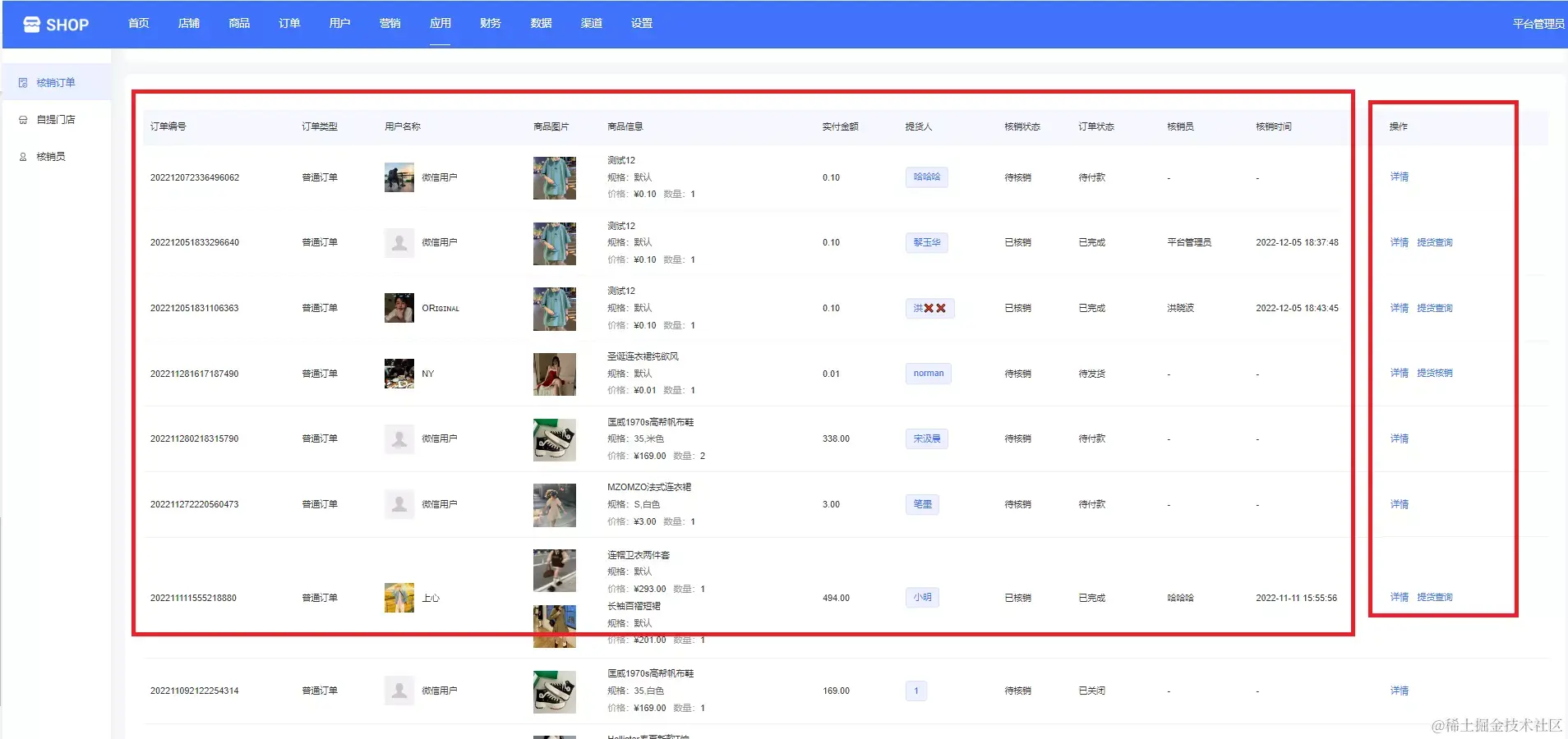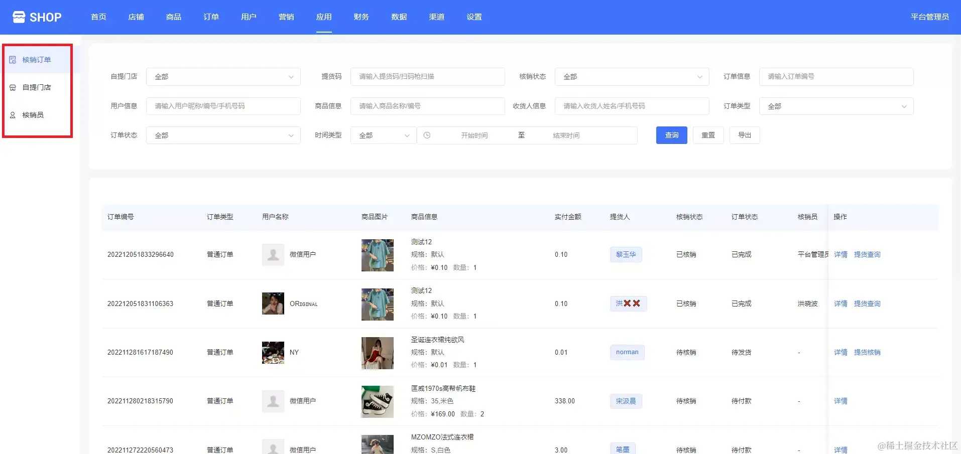 下面有订单编号、订单类型、用户名称、商品图片、商品信息、实付金额、提货人、核销状态、订单状态、核销员、核销时间、还可以进行详情、提货查询等操作,如下图所示: