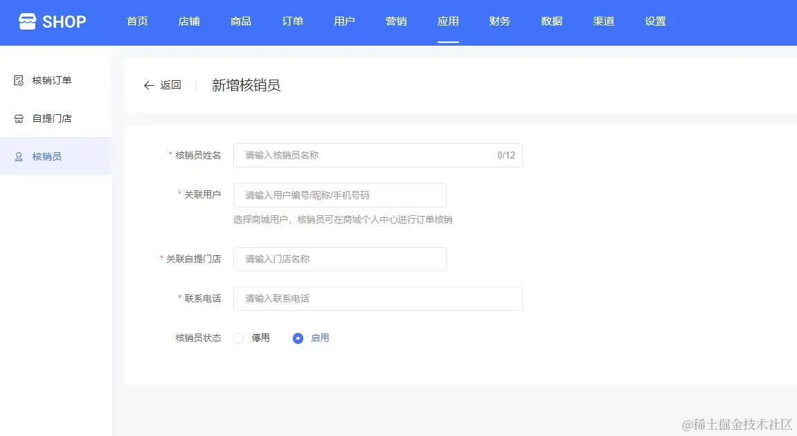 输入核销员姓名、关联用户(选择商城用户,核销员可在商城个人中心进行订单核销)、关联自提门店、联系电话、核销员的状态等信息,新增核销员,如下图所示: