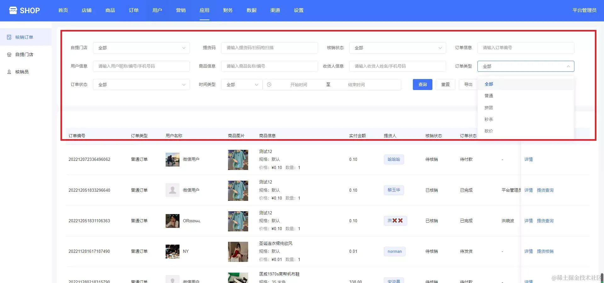 平台管理可以通过选择自提门店、输入提货码、选择核销状态、输入订单信息、用户信息、商品信息收货人信息、选择订单类型(普通、拼团、秒杀、砍价)、订单状态、时间类型等来查询订单,如下图所示: