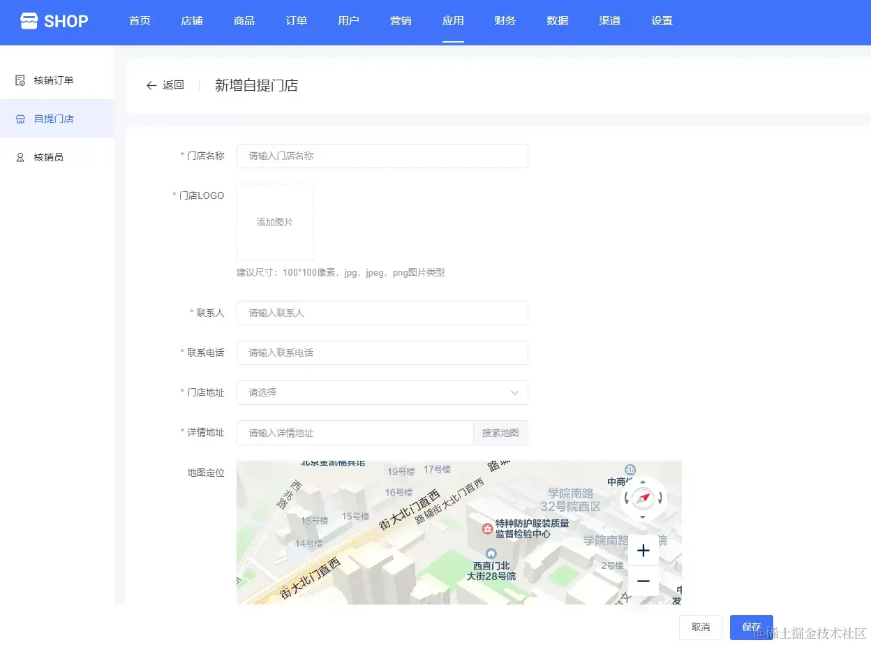 输入门店名称、门店LOGO、联系人、联系电话、门店地址、详情地址、地图定位等基本信息新增自提门店,如下图所示: