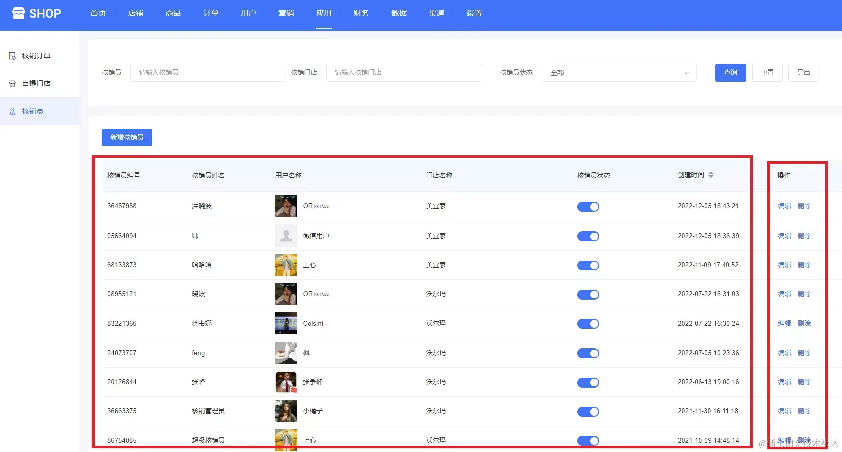 下面可以看到核销员编号、核销员姓名、用户名称、门店名称、核销员状态、创建时间等,还可以进行编辑,删除等操作,如下图所示: