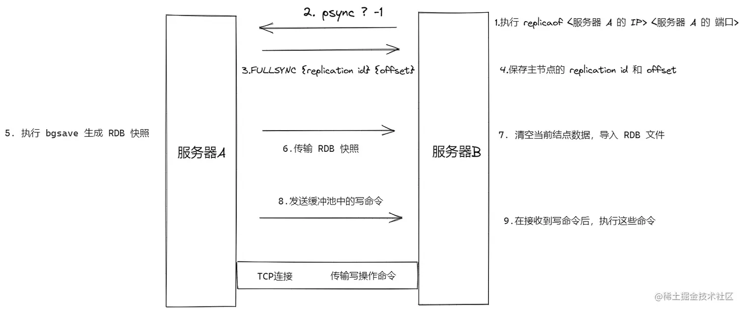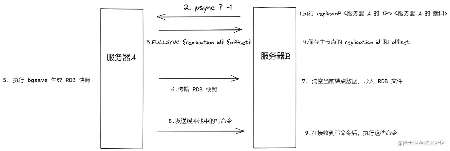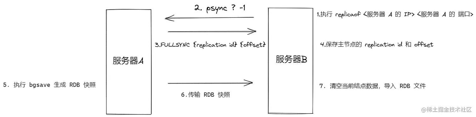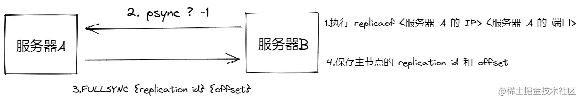 对于第一次同步的服务器B来说,并没有主服务器的replication id,且没有进行过复制,因此发送的命令为:psync ? -1
