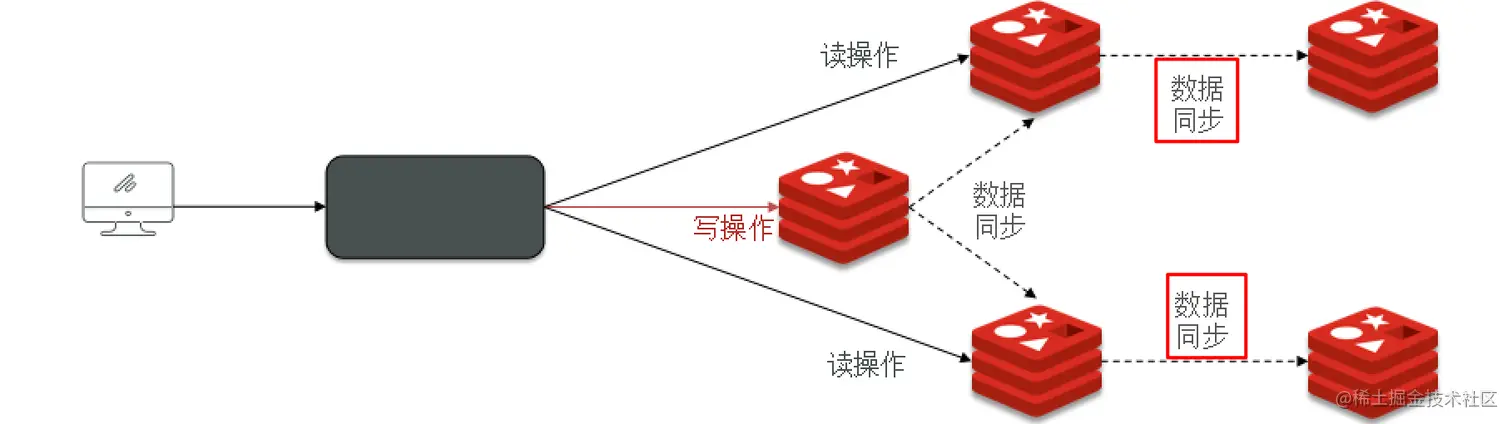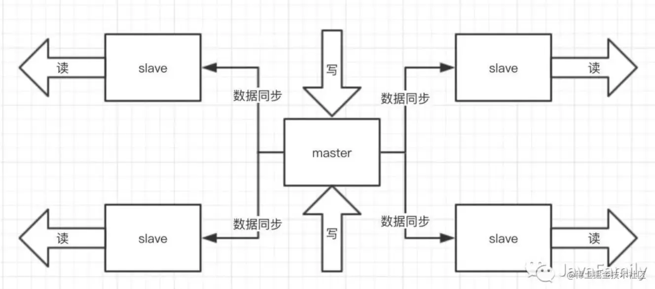 Redis的特性就是必须支撑读高并发的,单节点Redis并发能力虽然不错,但是在高并发场景下也顶不住,且单节点如果宕机了,就会导致服务不可用。因此就有了主从这样的架构模式,给master去写,数据同步给它的小弟slave去读(读写分离),这样请求就可以分发在多个Redis结点上了,同时也方便了水平扩容: