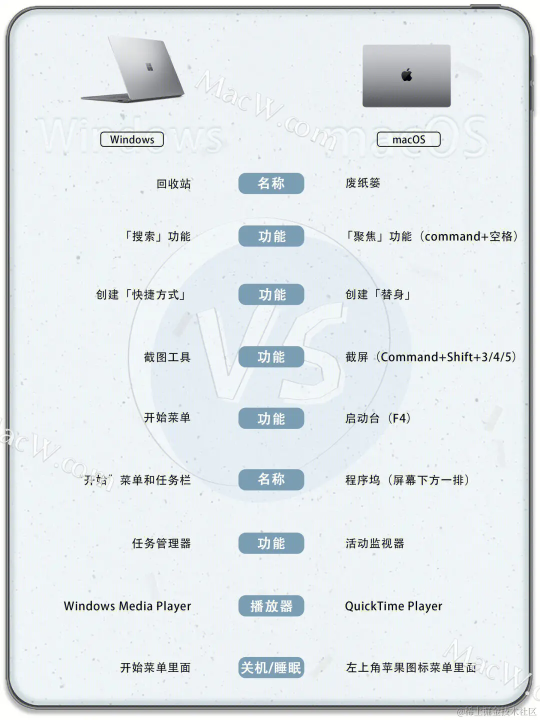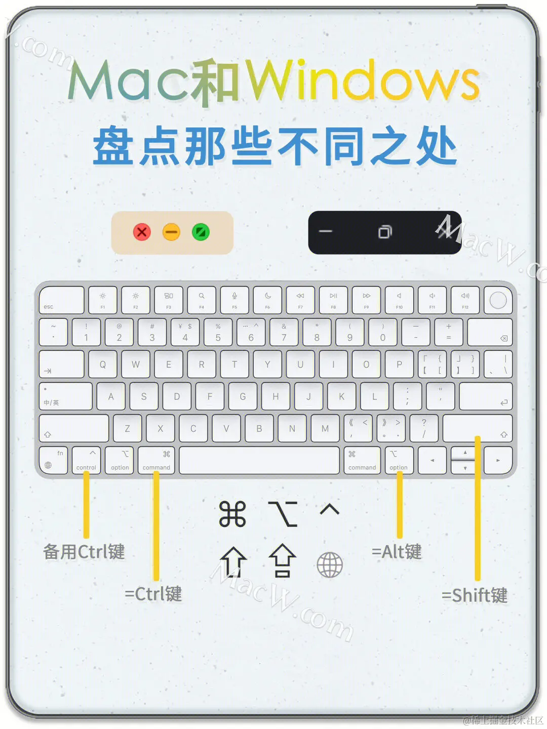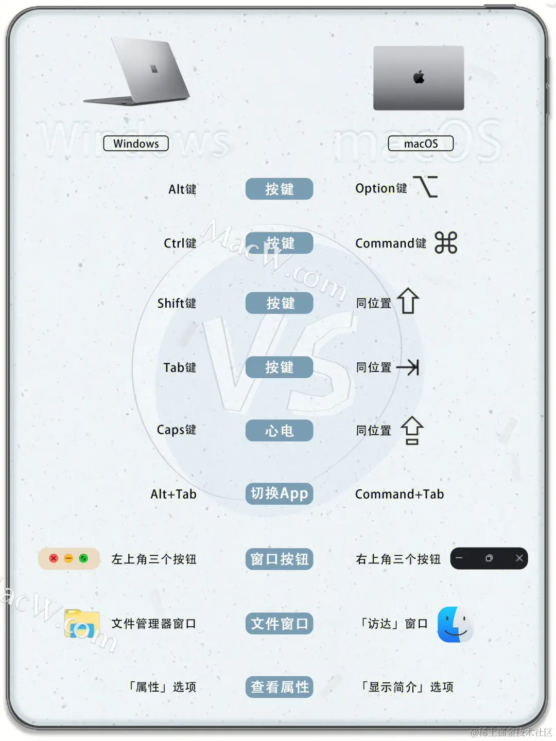 很多用了很多年Windows系统的朋友来说,下定决心觉得入手Mac,结果一上手发现怎么跟Windows完全不一样?其实细看就会发现,其中一个逻辑就是“反过来的”~比如说: “开始”按钮Win在下面,Mac是在左上角; 关闭/最小化按钮Win在右上角,Mac在左上角 再来就是一些完全不同的“叫法”啦,比如Win的文件管理在Mac是叫“访达”等等 所以这次一次性给大家整理出了Mac跟Win的不同点合集,方便大家在刚上手苹果电脑Mac的时候参考啦~