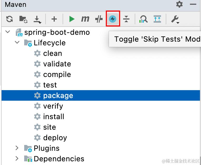 Maven 命令栏的工具栏有下图中的图标,这个图标就是 Skip Tests。点击选中,再用 LifeStyle 中的打包就会跳过测试。2022 版本 IDEA,图标可能和以前的版本有些许区别,新版的是一个圆圈加闪电显示 Toggle 'Skip Tests' Mode
