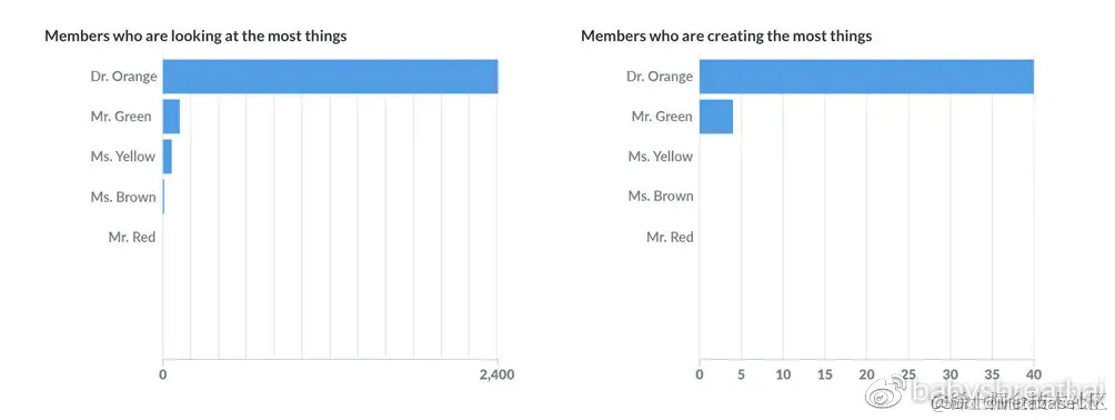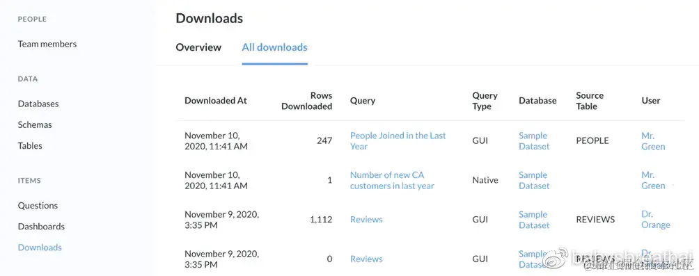 Brown女士最近辞职了,我们想检查一下她在工作的最后一周查看了哪些数据。要查看人们查看的数据,我们将使用审核侧边栏在左边选择团队成员这让我们很好地了解谁是最活跃的Metabase用户(图4)。