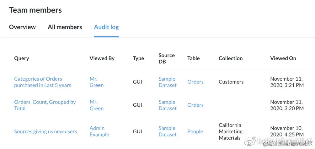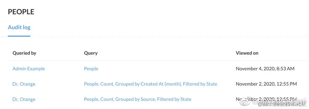 图1。团队成员的审核日志,使管理员可以查看人们如何使用Metabase。