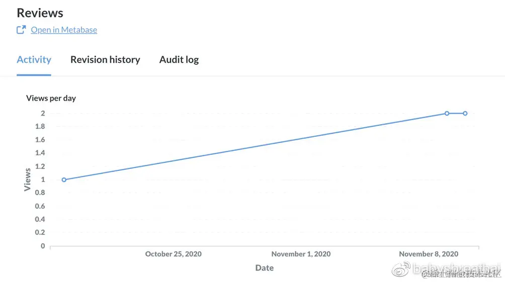 在列表的顶部我们可以看到Orange博士的下载是一个名为Reviews的查询。如果我们需要更多信息,我们可以点击问题并选择在Metabase中打开.