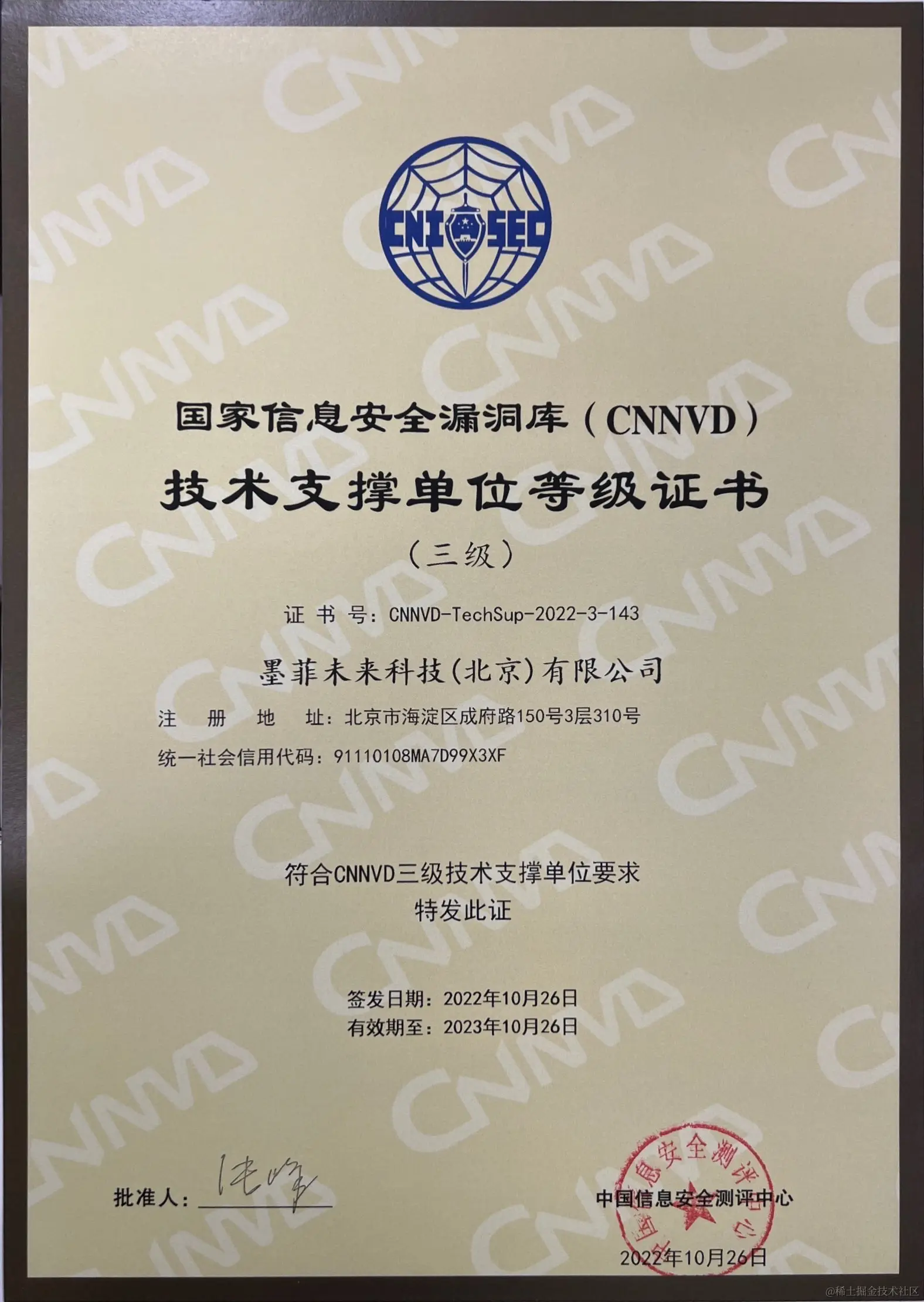 近日,墨菲未来科技(北京)有限公司荣获《国家信息安全漏洞库(CNNVD)技术支撑单位等级证书》,正式成为 CNNVD 技术支撑单位之一。