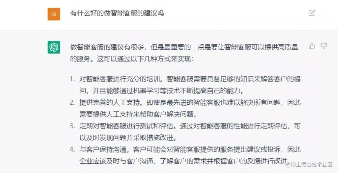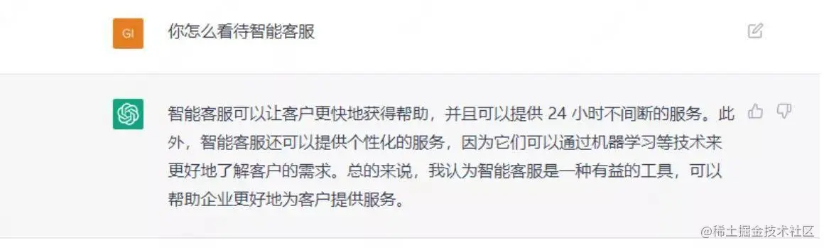 首先,我们向 ChatGPT 提问它对智能客服行业的看法,它的回答是这样的: