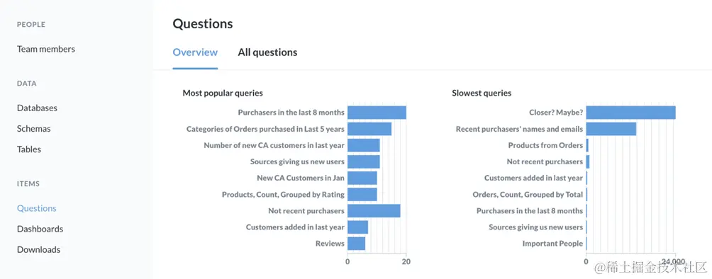 假设我们最近锁定了一个关键问题,重要用户,并想看看固定它是否有助于推动问题的流量。在问题部门 “ 概述 ” 选项卡,我们将看到两个图表:最流行的查询和加载最慢的查询。