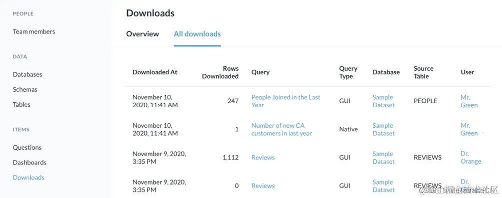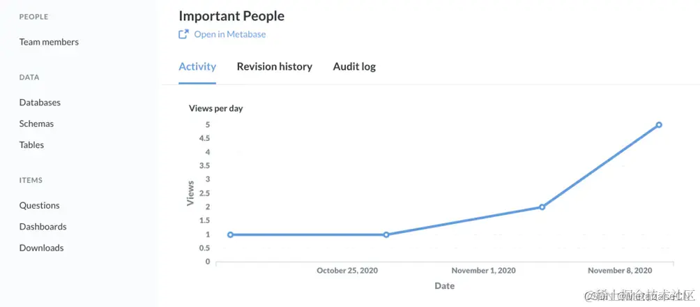 Brown女士最近辞职了,我们想检查一下她在工作的最后一周查看了哪些数据。要查看人们查看的数据,我们将使用审核侧边栏在左边选择团队成员这让我们很好地了解谁是最活跃的Metabase用户(图4)。