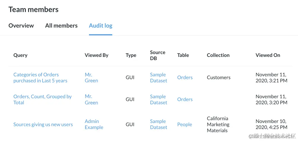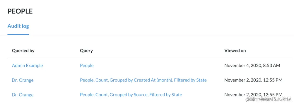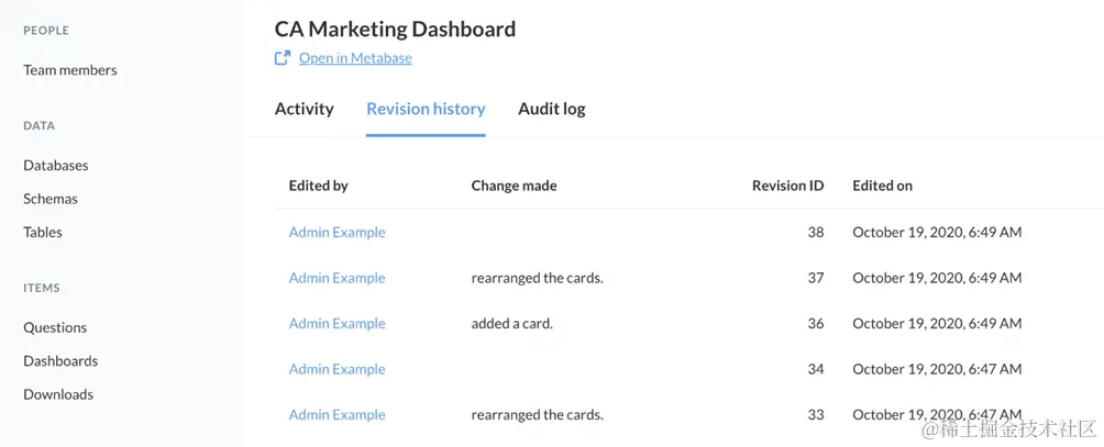 图1。团队成员的审核日志,使管理员可以查看人们如何使用Metabase。
