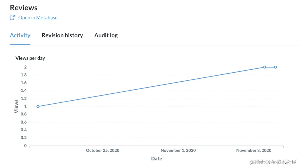 在列表的顶部我们可以看到Orange博士的下载是一个名为Reviews的查询。如果我们需要更多信息,我们可以点击问题并选择在 Metabase 中打开.