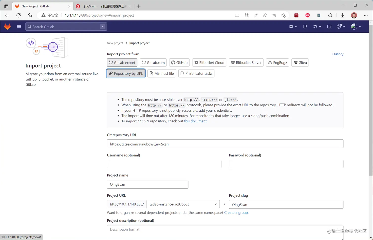 http://10.1.1.140:880/projects/new#import_project,然后选择Repository by URL,然后填入一个可以被拉取的仓库地址,这里我提供一个供大家实验,如下图所示