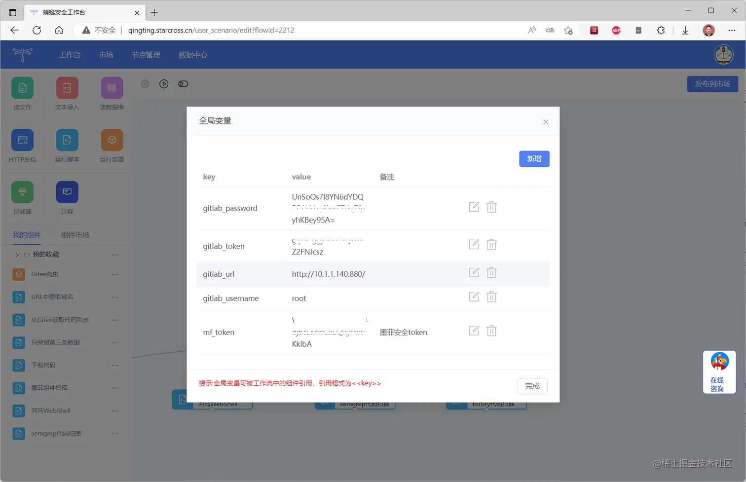在编排工作流页面,上方有一个设置全局变量的小图标,按照提示配置必要参数,如下图所示