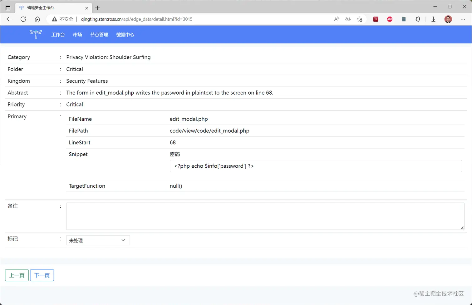 在列表页面只展示了一小部分数据,可以点击查看按钮,在详情页查看详细的漏洞信息,用于审计标注,如下图所示。