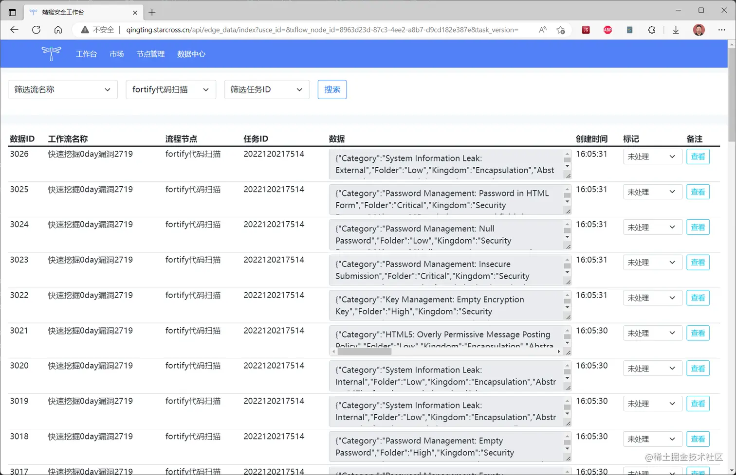 我选中fortify代码扫描节点,筛选出来的列表页面如下所示