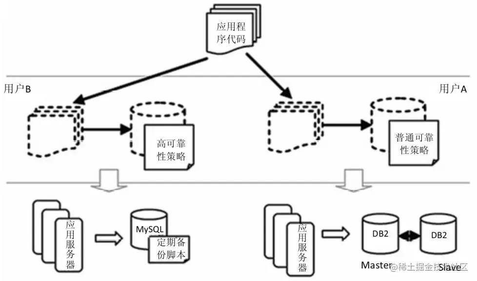 我们可以通过一个关于数据高可用性的例子来看平台层给用户所带来的便利,如图1所示。假设用户A和用户B都需要CRM的应用,用户A 需要很高的数据可用性,而用户B则不太关心这个问题。开发人员只需要进行一次开发就能满足这两个企业的功能性需求,而应用管理人员则只需要在部署的时候根据业务的需求选择配置策略,云平台会自动为它们产生不同的部署和配置。比如用户A的高可用性需求通过主从方式的商业数据库来满足,而用户B的数据可用性配置为开源数据库的定期备份。